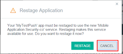 After creation we will be promted to restage our app, but we will do this after adding the Push service so press Cancel for now